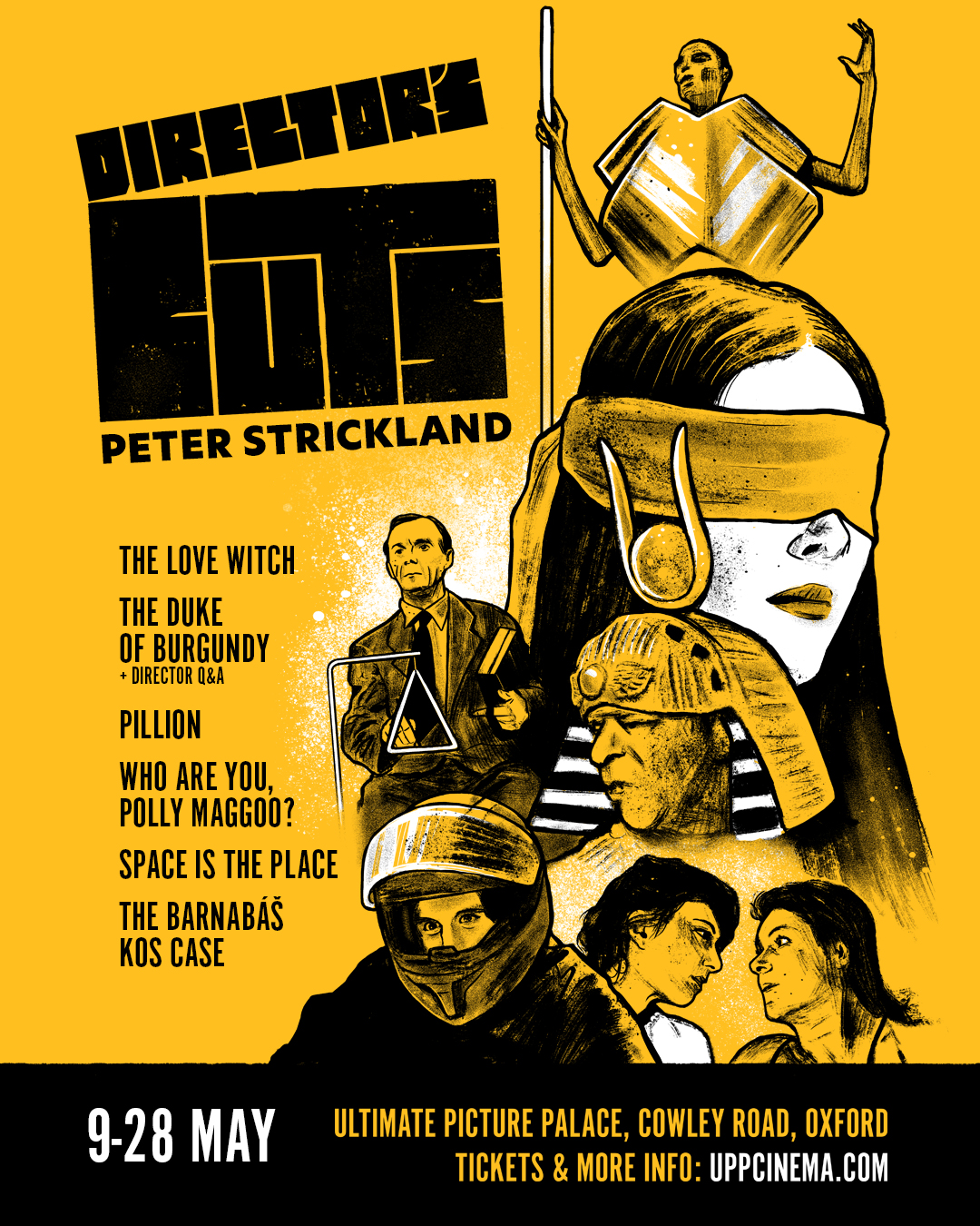 “Six films specially picked for the Ultimate Picture Palace. No overriding theme and more of an intuitive selection of the new and the old along with the known and unknown. Harry Lighton’s Pillion: fresh from its release last year and a compatible (almost) all-male foil to the all-female Duke of Burgundy. The heliocentric wonders of Space is the Place bring Sun Ra to earth in John Coney’s ‘70s cosmic caper. William Klein brings his photographer’s eye to the wildly inventive and woefully overlooked ‘60s fashion mockumentary Who Are You, Polly Maggoo? Peter Solan’s The Case of Barnabáš Kos could almost be a documentary in its absurd portrayal of a triangle player promoted to orchestra director due to his political fealty. Needless to say, still relevant. Lastly, Anna Biller’s The Love Witch finds a series of besotted men fall victim to the titular witch of love. Also still relevant.” – Peter Strickland